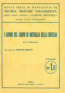 BARBATO Domenico (ten. col.), I lavori del campo di battaglia della fanteria, Roma, Rivista 'Nazione Militare' (Coll. Manualetti di tecnica militare), 1937, spill., pp 36, 58 ill. n.t., f.to 17,2x24,3. (ITA)