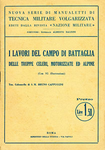 CAPPUCCINI Bruno (ten. col. di S.M.), I lavori del campo di battaglia delle truppe celeri, motorizzate ed alpine, Roma, Rivista 'Nazione Militare' (Coll. Manualetti di tecnica militare), 1938, spill., pp 52, 95 ill. n.t., f.to 17,2x24,3. (ITA)