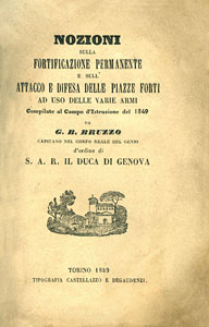 BRUZZO Giovanni Battista, Nozioni sulla fortificazione permanente e sull'attacco e difesa delle piazze forti ad uso delle varie armi. Compilate al campo d'istruzione del 1849 da G.B. Bruzzo, capitano nel Corpo Reale del Genio d'ordine di s.a.r. il duca di Genova, Torino, Tip. Castellazzo e Degaudenzi, 1849, br., pp 127, 3 tav. in b./n. f.t., f.to 10x15. (ITA) |
