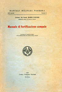 PAPONE Mario (Col. Genio, Insegnante presso la Scuola di Guerra), Manuale di fortificazione campale, Roma, C. Voghera (Coll.: Manuali militari Voghera. Serie teorica, n.4), 1927, br., pp 141, ill. in b./n. n.t., f.to 16x23,2. (ITA)