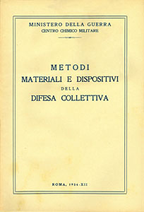 MINISTERO DELLA GUERRA. CENTRO CHIMICO MILITARE, Metodi materiali e dispositivi della difesa collettiva, Roma, s.e., 1934-XII, spill., pp 18, f.to 16,8x24,3. (ITA)