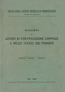 SCUOLA UNICA ALLIEVI UFFICIALI DI COMPLEMENTO, Sinossi di lavori di fortificazione campale e mezzi tecnici dei pionieri. 1951-1952, Vol. 1: Testo, Lecce, Tipografia Scuola Unica Allievi Ufficiali Complemento, s.d., br., pp 96, f.to 17x24. (ITA)