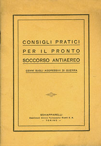 s.n., Consigli pratici per il pronto soccorso antiaereo. Cenni sugli aggressivi di guerra, Torino, Schiapparelli, 1940-XVIII, spill., pp 64, f.to 12x17. (ITA)