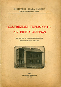 MINISTERO DELLA GUERRA. CENTRO CHIMICO MILITARE, Costruzioni predisposte per difesa antigas. Mostra del II Congresso Nazionale degli Ingegneri Italiani, Roma, Tipografia Regionale, 1931, spill., pp 14, ill. in b./n. n.t., f.to 17x24. (ITA)