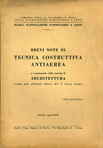 COMANDO DELLA R. ACCADEMIA E DELLA SCUOLA D'APPLICAZIONE D'ARTIGLIERIA E GENIO, Brevi note di tecnica costruttiva antiaerea a complemento delle nozioni di Architettura svolte agli ufficiali allievi del 1° Corso Genio. Edizione fuori commercio, Torino, Stabil. Poligr. Roggero & Tortis, 1940-XIX, spill., pp 38, f.to 17x24. (ITA) |