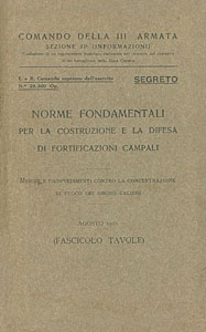 COMANDO 3^ ARMATA. SEZIONE II^ (INFORMAZIONI), Norme fondamentali per la costruzione e la difesa di fortificazioni campali. Misure e provvedimenti contro la concentrazione di fuoco dei grossi calibri (I. e R. Comando supremo dell'esercito N° 28.300 Op.) (Traduzione di un regolamento Austriaco rinvenuto nel ricovero del comando di un battaglione nella Zona Carsica). Tavole, s.l., s.n., Agosto 1916, br., 25 tavole in b./n. f.t., f.to 12 x18,5. (ITA) |