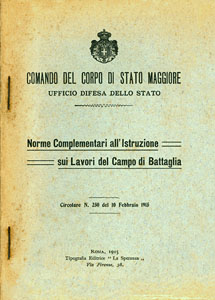 COMANDO DEL CORPO DI STATO MAGGIORE. UFFICIO DIFESA DELLO STATO, Norme complementari all'Istruzione sui lavori del campo di battaglia. Circolare N. 250 del 10 Febbraio 1915, Roma, Tipografia Editrice 'La Speranza', 1915, spill., pp 32, 28 figure f.t., f.to 12,5x17. (ITA) |