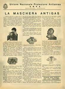UNIONE NAZIONALE PROTEZIONE ANTIAEREA. PRESIDENZA GENERALE, La maschera antigas, Roma, U.N.P.A. (Arti grafiche Ugo Pinnaṛ), 1935-XIII, volant., pp 1, ill. in b./n. n.t., f.to 31,5x43,8. (ITA)