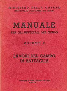 MINISTERO DELLA GUERRA. ISPETTORATO DELL'ARMA DEL GENIO, Manuale per gli ufficiali del Genio, Vol. 1: Lavori del campo di battaglia, Pavia, Tipografia Luigi Rossetti fu Caio, 1942-XXI, br., pp XXIII-611, ill. in b./n. n.t. e 5 tavole f.t., f.to 11,5x15,3. (ITA) |