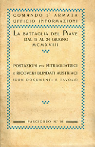 COMANDO 3^ ARMATA. UFFICIO INFORMAZIONI, Postazioni per mitragliatrici e ricoveri blindati austriaci (con documenti e tavole), s.l., s.e. (Coll. La battaglia del Piave dal 15 al 24 giugno MCMXVIII, n.10), s.d., spill., pp 13, 7 tavole f.t., f.to 15x22,5. (ITA) |