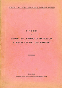 SCUOLE ALLIEVI UFFICIALI COMPLEMENTO, Sinossi di lavori sul campo di battaglia e mezzi tecnici dei pionieri. 1960-1961, Lecce, Tipografia Scuola Allievi Ufficiali Complemento, s.d., br., pp 164, ill. in b./n. n.t., f.to 17x24. (ITA)