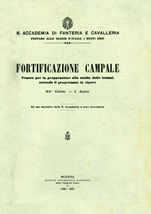 R. ACCADEMIA DI FANTERIA E CAVALLERIA, Fortificazione campale: Tracce per la preparazione allo studio delle lezioni secondo il programma in vigore. 84° Corso - I Anno (ad uso esclusivo della R. Accademia e fuori commercio), Modena, Società Tipografica Modenese. Antica Tipografia Soliani, 1941-XIX, br., pp 292, f.to 22x32. (ITA) |
