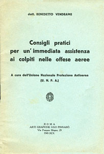 VENDRAME Benedetto (Dott.), Consigli pratici per un'immediata assitenza ai colpiti nelle offese aereei. A cura dell'Unione Nazionale Protezione Antiaerea (U.N.P.A.), Roma, Arti Grafiche Ugo Pinnaṛ, 1941-XIX, spill., pp 30, 11 ill. in b./n. n.t., f.to 10,7x15,5. (ITA) |