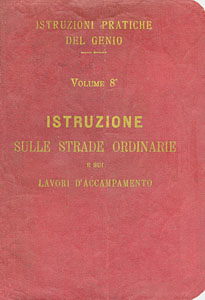MINISTERO DELLA GUERRA, Istruzioni pratiche del Genio, Vol.8: Isruzione sulle strade ordinarie e sui lavori d'accampamento, Roma, E. Voghera, br., 1898, pp 75, 72 ill. in b./n. n.t., f.to 14,2x20,5. (ITA)