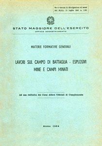 STATO MAGGIORE DELL'ESERCITO. UFFICIO ADDESTRAMENTO, Materie formative generali: Lavori sul campo di battaglia - Esplosivi mine e campi minati. Ad uso esclusivo dei Corsi Allievi Ufficiali di Complemento, Roma, Stato Maggiore dell'Esercito, 1964, br., pp 185, ill. in b./n. n.t., f.to 17x24. (ITA) |