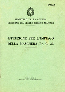 MINISTERO DELLA GUERRA. DIREZIONE DEL CENTRO CHIMICO MILITARE, Istruzione per l'impiego della maschera Pr. C.33 (bozza), Milano, Tipografia degli Stabilimenti Pirelli, 1933-XI, spill., pp 9, ill. in b./n. n.t., f.to 12x17. (ITA)