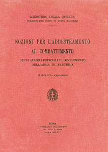 MINISTERO DELLA GUERRA. COMANDO DEL CORPO DI STATO MAGGIORE, Nozioni per l'addestramento al combattimento per i corsi Allievi Ufficiali di Complemento dell'Arma di Fanteria, Parte 2^: Applicativa, Roma, Tipografia del Senato, 1936-XIV, br., pp 139, ill. in b./n. n.t., f.to 16,2x22,2. (ITA) |