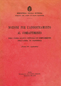 MINISTERO DELLA GUERRA. COMANDO DEL CORPO DI STATO MAGGIORE, Nozioni per l'addestramento al combattimento per i corsi Allievi Ufficiali di Complemento dell'Arma di Fanteria, Parte 2^: Applicativa, Roma, Edizioni de 'Le Forze Armate', 1938-XVI, br., pp 145, 72 ill. in b./n. n.t. + 2 allegati n.t., f.to 16,2x22,2. (ITA) |