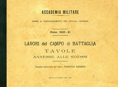 GENESIO Federico (T. Colonnello del Genio) (in testa: Accademia Militare. Corso di perfezionamento per ufficiali inferiori. Anno 1920-1921), Lavori del campo di battaglia. Tavole annesse alla sinossi, Torino, Stabilimento Tipo-Litografico E. Bachi, 1920, br., 78 tavole f.t., f.to 35x25,5. (ITA) |