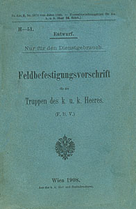 ?, Feldbefestigungsvorschrift für die Truppen des K.u.K. Heeres (F.B.V.) (H-51, Entwurf nur für den Dienstgebrauch), Wien, K.K. Hof- und Staatsdruckerei, 1908, pp VII-92, 4 tav. in b./n. f.t., f.to 10x15. (DEU)