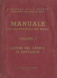 MINISTERO DELLA GUERRA. ISPETTORATO DELL'ARMA DEL GENIO, Manuale per gli ufficiali del Genio, Vol. 1: Lavori del campo di battaglia, Pavia, La Tipografica Ticinese, 1941-XIX, br., pp 453, 195 ill. in b./n. n.t. + 38 tabelle n.t., f.to 12x16,8. (ITA)
