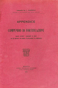 MARINELLI L. (Col., Ing., titolare di Fortificazione alla Scuola Militare), Appendice al compendio di fortificazione esposto secondo i programmi in vigore per gli aspiranti alla nomina di sottotenente di complemento, Modena, Società Tipografica Modenese, 1915, spill., pp 16, 28 ill in b./n. n.t., f.to 16x23,2. (ITA) |