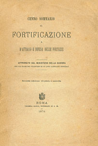 MINISTERO DELLA GUERRA, Cenno sommario di fortificazione e d'attacco e difesa delle fortezze approvato dal Ministero della Guerra per gli esami dei volontari di un anno aspiranti ufficiali, Roma, Carlo Voghera, 1874, br., pp 76, f.to 11x16. (ITA)
