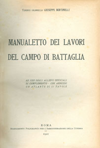 BERTINELLI Giuseppe (Ten. Col.), Manualetto dei lavori del campo di battaglia. Ad uso degli allievi ufficiali di complemento. Con annesso un atlante di 31 tavole, Roma, Stabilimento Poligrafico per l'Amministrazione della Guerra, 1921, br., pp VI-135, 31 tavole in b./n. f.t., f.to 22x32. (ITA) |