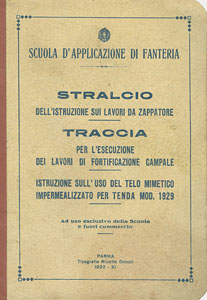 SCUOLA DI APPLICAZIONE DI FANTERIA, Stralcio dell'istruzione sui lavori da zappatore – Traccia per l'esecuzione dei lavori di fortificazione campale – Istruzione sull'uso del telo mimetico impermeabilizzato per tenda mod.1929 (Ad uso esclusivo della Scuola e fuori commercio), Parma, Tipografie Riunite Donati, 1932-XI, br., pp VIII-380, 413 ill. in b./n. f.t., f.to 11,8x16,7. (ITA) |