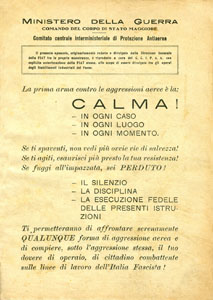 MINISTERO DELLA GUERRA. COMANDO DEL CORPO DI STATO MAGGIORE. COMITATO CENTRALE INTERMINISTERIALE DI PROTEZIONE ANTIAEREA, Se un'aggressione viene dal cielo... Che cosa fa l'operaio Fiat? [il presente opuscolo, originariamente redatto e divugalto dalla Direzione Generale della FIAT fra le proprie maestranze, è riprodotto a cura della C.C.I.P.A.A. con esplicita autorizzazione della FIAT stessa, allo scopo di essere divulgato fra gli operai degli stabilimenti industriali del Paese], s.l., s.e., s.d., spill., pp 15, ill. a col. n.t., f.to 13,5x18,5. (ITA) |