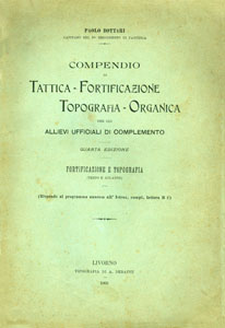 BOTTARI Paolo (Cap. nel 45° Rgt. Fanteria), Compendio di tattica - fortificazione - topografia - organica per gli Allievi ufficiali di complemento. Fortificazione e topografia (Testo e atlante), Livorno, Tipografia di A. Debatte, 1903 (4^ Ed.), br., pp 119, ill. in b./n. f.t., f.to 17x24,5. (ITA) |
