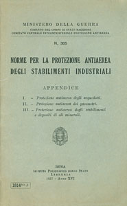 MINISTERO DELLA GUERRA. COMANDO DEL CORPO DI S.M.. COMITATO CENTRALE INTERMINISTERIALE DI PROTEZIONE ANTIAEREA, Norme per la protezione antiaerea degli stabilimenti industriali (n.305). Appendice: I. Protezione antiaerea degli acquedotti - II. Protezione antiaerea dei gazometri - III. Protezione antiaerea degli stabilimenti e depositi di oli minerali, Roma, Istituto Poligrafico dello Stato. Libreria, 1937-XVI, spill., pp 30, f.to 11,5x18. (ITA) |