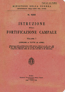 MINISTERO DELLA GUERRA. ISPETTORATO DELL'ARMA DEL GENIO, Istruzione sulla fortificazione campale, Vol.1: Comune a tutte le armi (n.4258) (Ristempa della pubblicazione 2795 edizione 1935 di cui alla circ.966 G.M.1935, aggiornata con la 1^ serie di aggiunte e varianti n.4127 categorico, edizione 1942, di cui alla circ.595, G.M. 1942-XX), Roma, Istituto Poligrafico dello Stato. Libreria, 1942-XX, br., pp 167, 198 ill. in b./n. n.t., f.to 14,6x20,5. (ITA) |