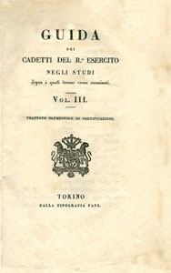 SIRI (magg. Genio), Guida dei cadetti del R. Esercito negli studi sopra i quali devono essere esaminati, Vol.3: Trattato elementale di fortificazione, Torino, Tipografia Pane, ?, br., pp VIII-255, 13 tav. in b./n. f.t., f.to 14x22. (ITA)