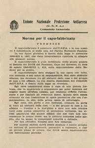 UNIONE NAZIONALE PROTEZIONE ANTIAEREA (U.N.P.A.). COMANDO GENERALE, Norme per il capo fabbricato, Roma, Arti Grafiche Santa Barbara, s.d., spill., pp 8, f.to 10,5x16,5. (ITA)