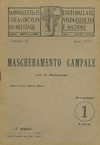 MORERA Umberto (magg. Genio), Mascheramento campale, Roma, Rivista 'Esercito e Nazione' (Coll. Manualetti di tecnica e di cultura militare, n.20), 1932-X, spill., pp 40, 33 ill. in b./n. n.t., f.to 17x24. (ITA)
