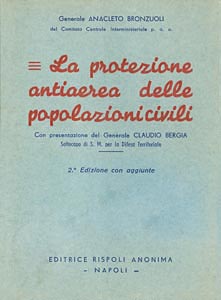 BRONZUOLI Anacleto (gen., vice presidente del Comitato Centrale Interministeriale P.A.A.), La protezione antiaerea delle popolazioni civili, Napoli, Editrice Rispoli Anonima, 1939 (2^ ed. con aggiunte), br., pp 128, ill. in b./n. n.t., pres. del gen. Claudio Bergia Sottocapo di S.M. per la Difesa Territoriale, f.to 12x16,5. (ITA) |