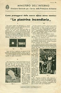 MINISTERO DELL'INTERNO. DIREZIONE GENERALE DEI SERVIZI PER LA PROTEZIONE ANTIAEREA, Come proteggersi dalla nuova offesa aerea nemica: 'La piastrina incendiaria', Roma, Istituto Poligrafico dello Stato, 1941-XIX, volantino, pp 1, ill. n.t., f.to 20x30. (ITA) |