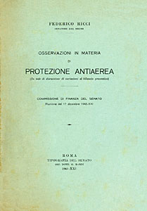 RICCI Federico (sen.), Osservazioni in materia di protezione antiaerea (In sede di discussione di variazioni al bilancio preventivo). Commissione di Finanza del Senato. Riunione del 17 dicembre 1942-XXI, Roma, Tipografia del Senato, 1943, spill., pp 11, f.to 15x21. (ITA) |