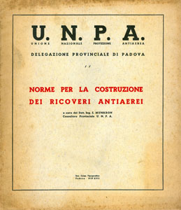 MUNARON E. (Dott. Ing., Consultore Provinciale U.N.P.A.) (In testa: U.N.P.A.. Delegazione provinciale di Padova), Norme per la costruzione dei ricoveri antiaerei, Padova, Soc. Coop. Tipografica, 1939-XVII, spill., pp 10, ill. in b./n. f.t., f.to 21,7x24,5. (ITA) |