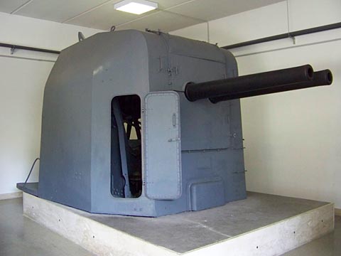 Esemplare su impianto binato navale, con affusto a piedistallo scudato (Arma proveniente dall'incrociatore 'Raimondo Montecuccoli')
